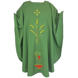 Chasuble brodée dos et devant réhaussée d'une broderie de fils d'or etd' argent en polyester laine. Cette chasuble est réalisable dans tous les coloris liturgiques .