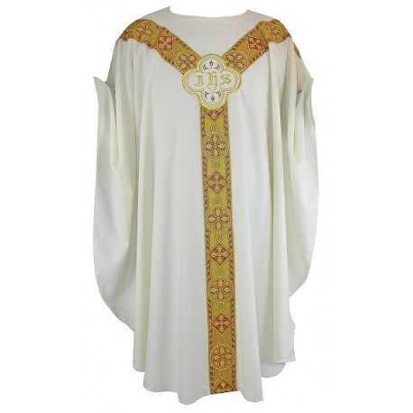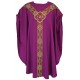 Chasuble avec son étole en polyester et laine. Le galon est cousu avec un médaillon brodé au centre sur le dos et le devant .