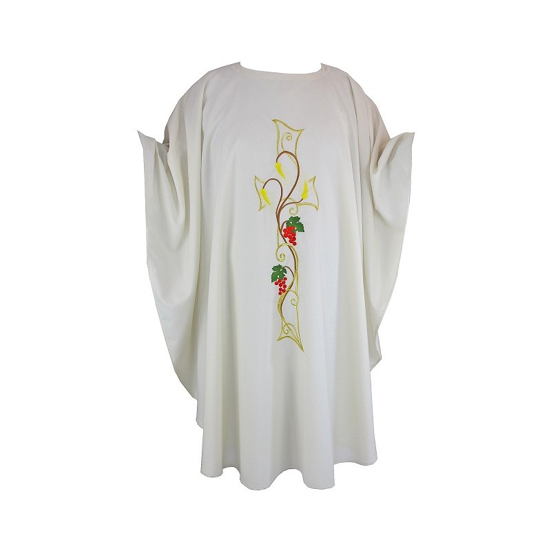 Chasuble non doublée en laine et polyester brodée dos et devant, avec étole simple ornée d'une petite croix brodée sur le col .