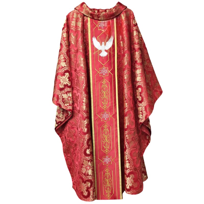 Chasuble de forme monastique confectionnée dans un tissu damassé et doublée, ornée d'un galon brodé assorti à l'avant et à l'arrière.